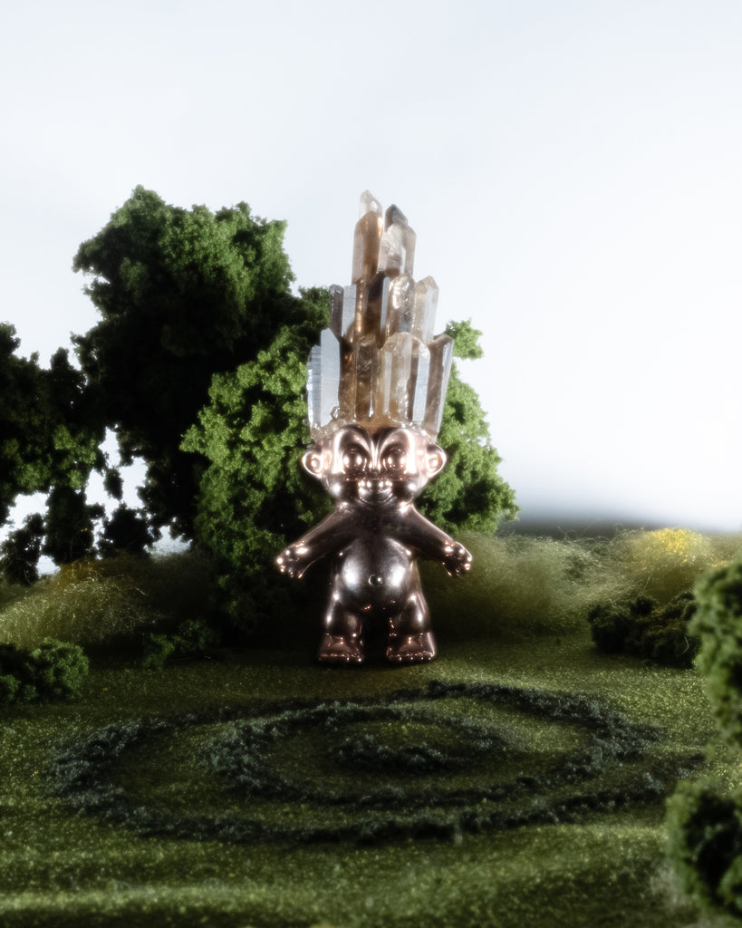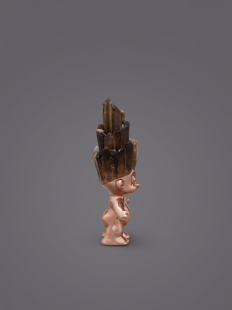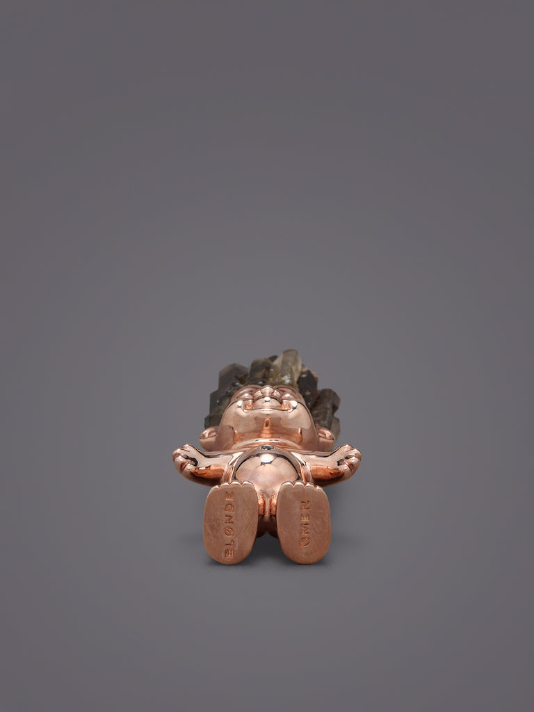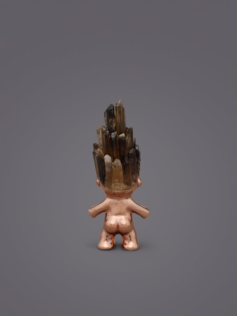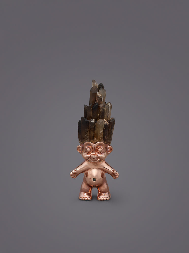 HANDMADE ROSE GOLD PLATED SOLID BRONZE TROLL DOLL WITH SMOKY QUARTZ CRYSTAL HAIR AND SET WITH A BLACK DIAMOND BELLYBUTTON.