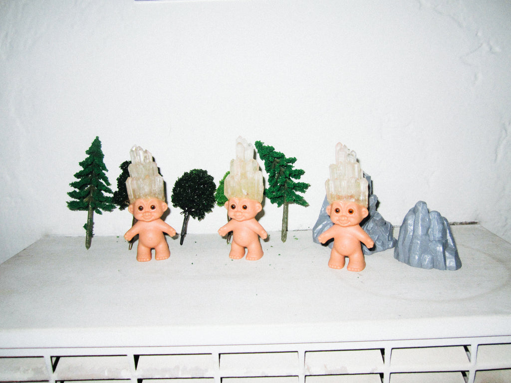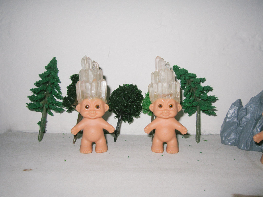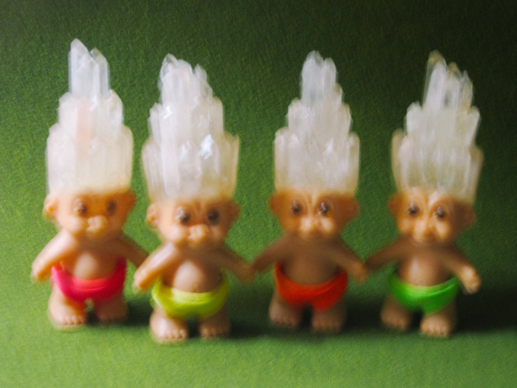 HANDMADE SMALL TROLL DOLL WITH PINK, ORANGE, GREEN, OR YELLOW BOTTOMS WITH QUARTZ CRYSTAL HAIR -- EACH SOLD SEPERATELY.