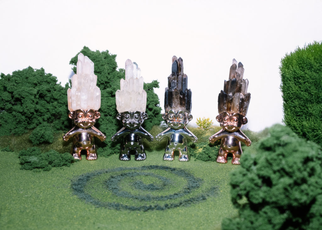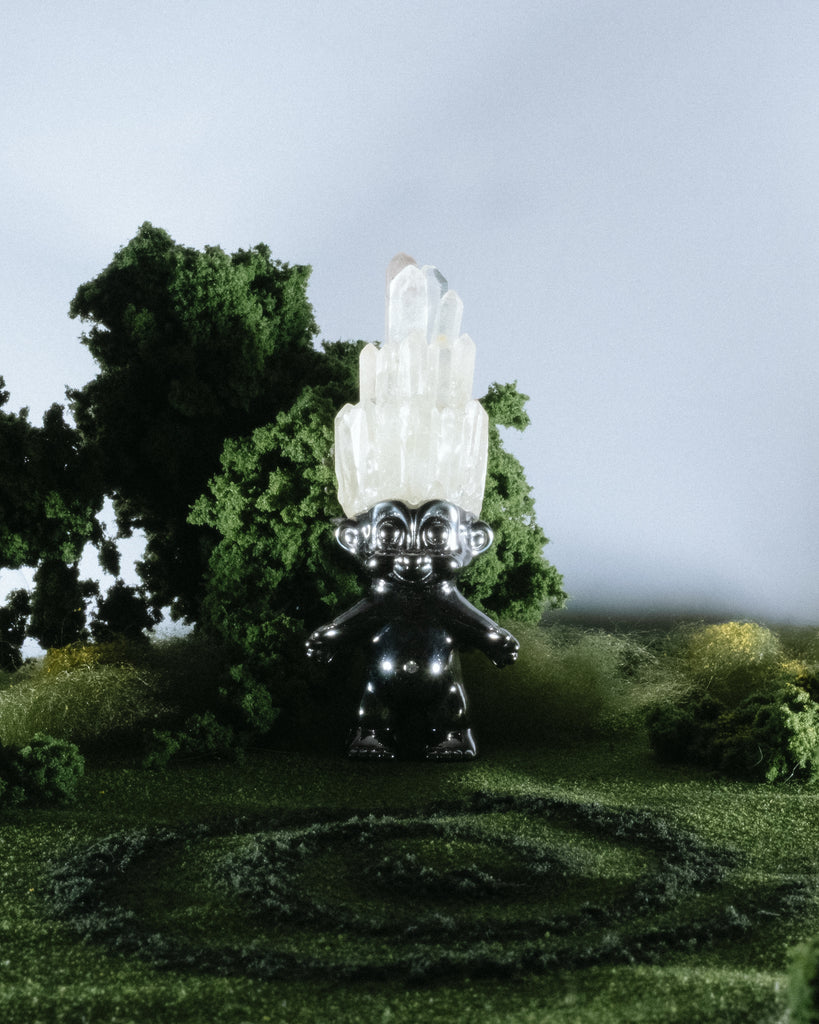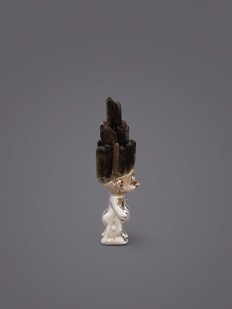 HANDMADE STERLING SILVER PLATED SOLID BRONZE TROLL DOLL WITH SMOKY QUARTZ CRYSTAL HAIR AND SET WITH A BLACK DIAMOND BELLYBUTTON.